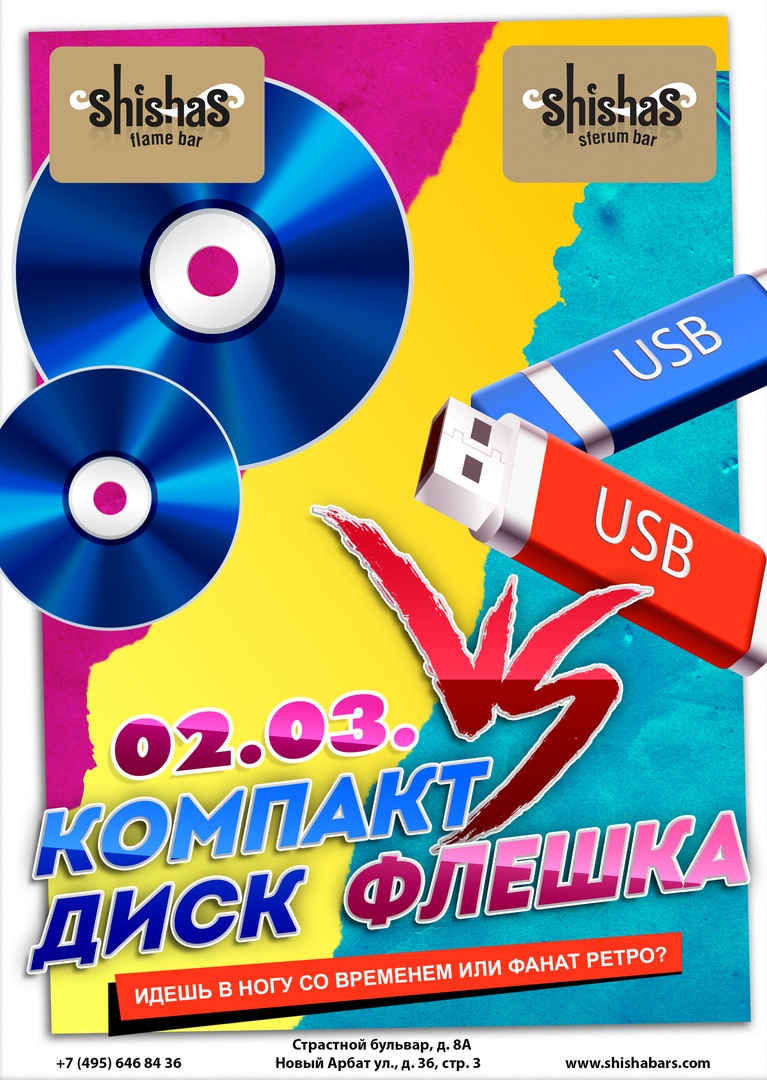 СУББОТА - 2 МАРТА 2019: Компак-диск VS Флешка в Shishas Flame Bar на Пушкинской и в Shishas Sferum Bar на Новом Арбате! Форматы меняются со скоростью света! Идешь в ногу со временем или фанат ретро? #СтрастиНаСтрастном и #АтмосфераСферы В этот день человечеству был впервые представлен компакт-диск - как революционный носитель информации, в том числе и музыкальной! Помните, какими они были дорогими и крутыми? Сегодня CD уже пылятся на полке, а на смену им пришли другие носители – флешки. Ну что же, пора смахнуть пыль с любимого компакт-диска и принести его в Shishas Flame Bar на Пушкинской! Или, как вариант, записать любимые треки на флешку и поделиться современным способом передачи информации в Shishas Sferum Bar на Новом Арбате! Оставь след своего настроения в сети заведений Shishas Bar! Первым компакт-диском, попавшим на прилавки магазинов, был альбом Билли Джоэла. Всего, по разным данным, за 25 лет в мире было продано более двухсот миллиардов CD! Вдумайтесь в эту цифру – двести! Миллиардов! И где они сейчас? Пылятся в гаражах, кладовках или других неподходящих местах. Так флешки, интернет и облачные сервисы отправили компакт-диски на свалку истории, отомстив им за кассеты. Теперь CD если и используют, то в качестве подставки под пиво или зеркала заднего вида – когда в офисе играют в рабочее время в пасьянс! :) Между тем, и вездесущей флешке уже угрожают тотальный вай-фай и облачные сервисы, благодаря которым больше не надо «скачивать песни», чтобы дать кому-нибудь «послушать любимую». К тому же от флешек часто исходит опасность – вирусы; а еще есть такие флешки, которые убивают любое устройство окончательно и бесповоротно. Да-да, при подключении к компьютеру, ноутбуку и другому устройству, такая флешка подает напряжение 220 Вольт и выжигает его до основания. Так что осторожнее принимайте информацию! Друзья, времена и форматы меняются, остается только одно – любимая музыка! Сотни, тысячи треков, которые никогда не устареют, на CD ли они, на флешке или на Саундклауде. Собирайте сегодня своих любимчиков и приходите в Shishas Flame Bar на Пушкинской и Shishas Sferum Bar на Новом Арбате – повеселимся вместе!
